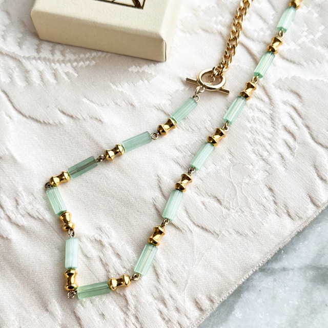 大人気、 スフレガラスネックレスの第二弾です! フランス製のスフレガラスの淡い色が上品な大人のかわいさを演出するネックレスです。 第二弾では、 辛口な印象を与えるチェーンを取り入れたデザイン。 ゴールドの小さなパーツも名脇役。 こちらはドイツ製のヴィンテージパーツを使用しています。 同素材のセットブレスレットを別ページにてご紹介しております。 着用写真は第一弾のデザインですが、スフレガラスビーズは同じ素材を使っています。太さ、長さの参考として掲載いたします。 長さ: 約38cm(着用写真) 約42cm