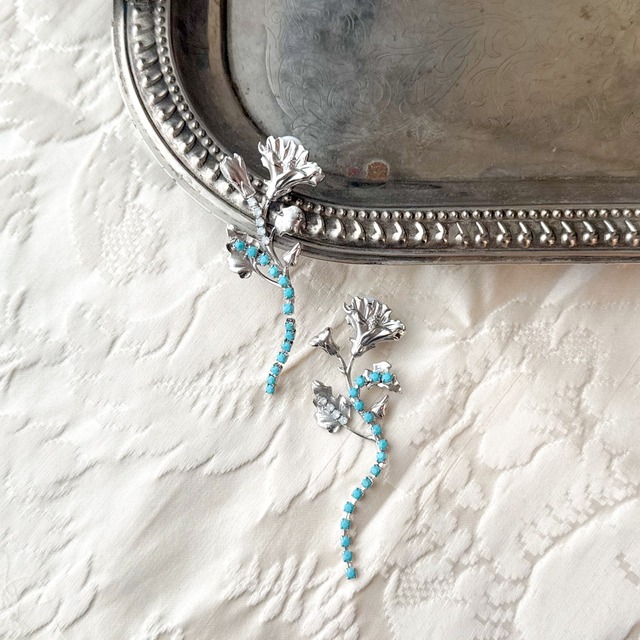 Coup de Cœur(クー・ドゥ・クール) 一目惚れを意味するフランス語です。 フランスで一目惚れして買い付けた、大きなお花の真鍮パーツ。 けれど不思議とデザインが決まらず、1年以上アトリエで眠っていた素材です。 「コンセプトを決めるのをやめて、ただ自分が美しいと思うものを作ろう」 そう思ったとき、ようやくかたちになりました。 この繊細な花のパーツは、18世紀から家具装飾のために作られてきたフランス製のもの。 そこに火の熱を使ってガラスストーンの土台を設置し、静かなきらめきを添えています。 大きな花の下に長く垂れるガラスストーンのチェーンは、 身につける人の動きに合わせて揺れ、光を集め、 ときに周りの視線を奪うかもしれません。 目を引く鮮やかなターコイズブルーのガラスは、不思議と肌馴染みが良い色でイエローベース、ブルーベースを問わず取り入れやすい色。 身につける人の個性を引き立ててくれます。 理由はなくても、心を打つ美しさがある。 夜景や星空、シンプルなサテンのドレスに宿る緊張感のように。 そんな「ただ、美しい」という感覚を形にした一点です。 この美しさを手に入れたら大切にしまうものではなく、 あえてあなたの日常生活の装いに合わせてみてくださいね。 素材: 真鍮(フランス製アンティーク)、 日本製ニッケルフリーメッキ、 ガラスストーン、 ステンレスポスト/真鍮クリップイヤリング