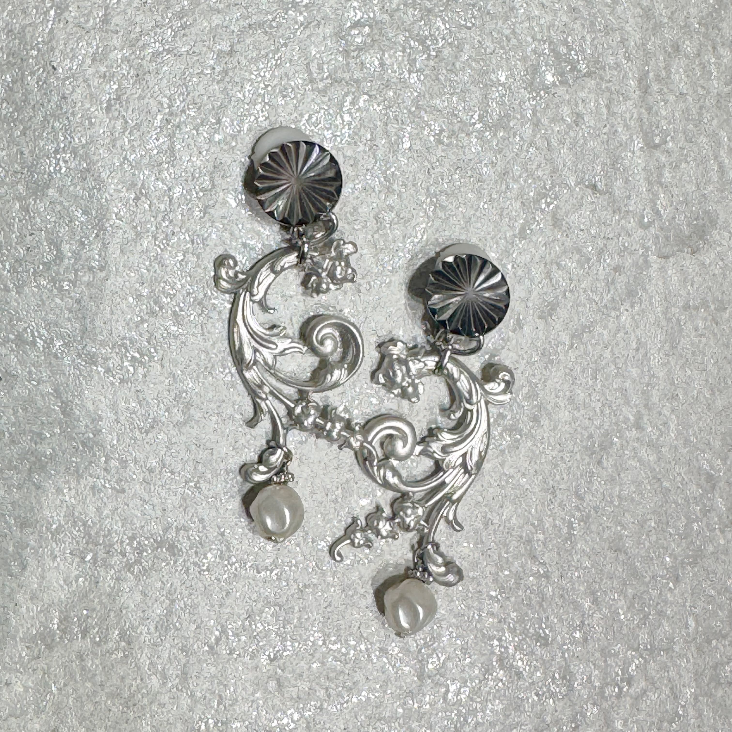 存在感のある金属の装飾パーツの下に揺れるのは、アクリル製のバロックパール。