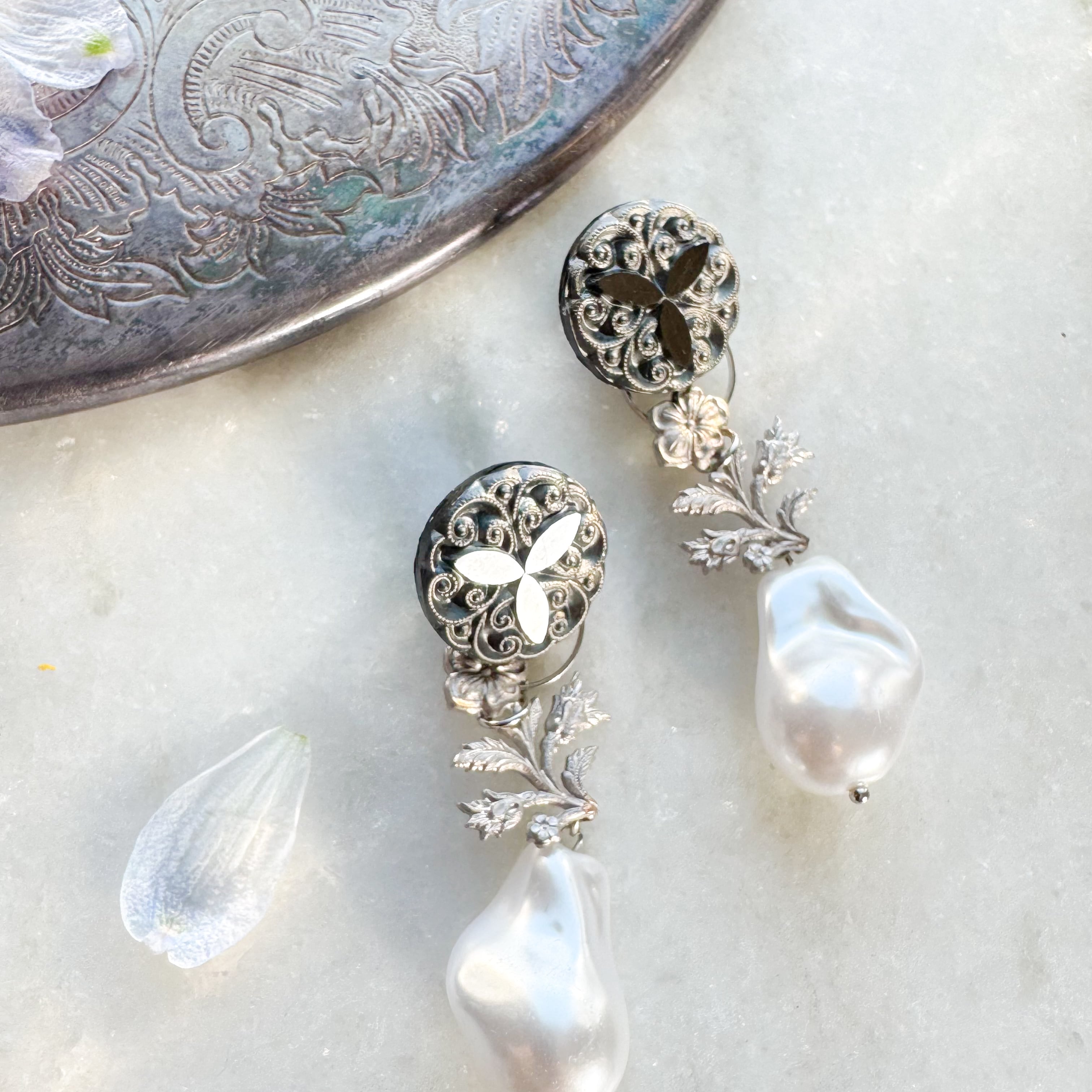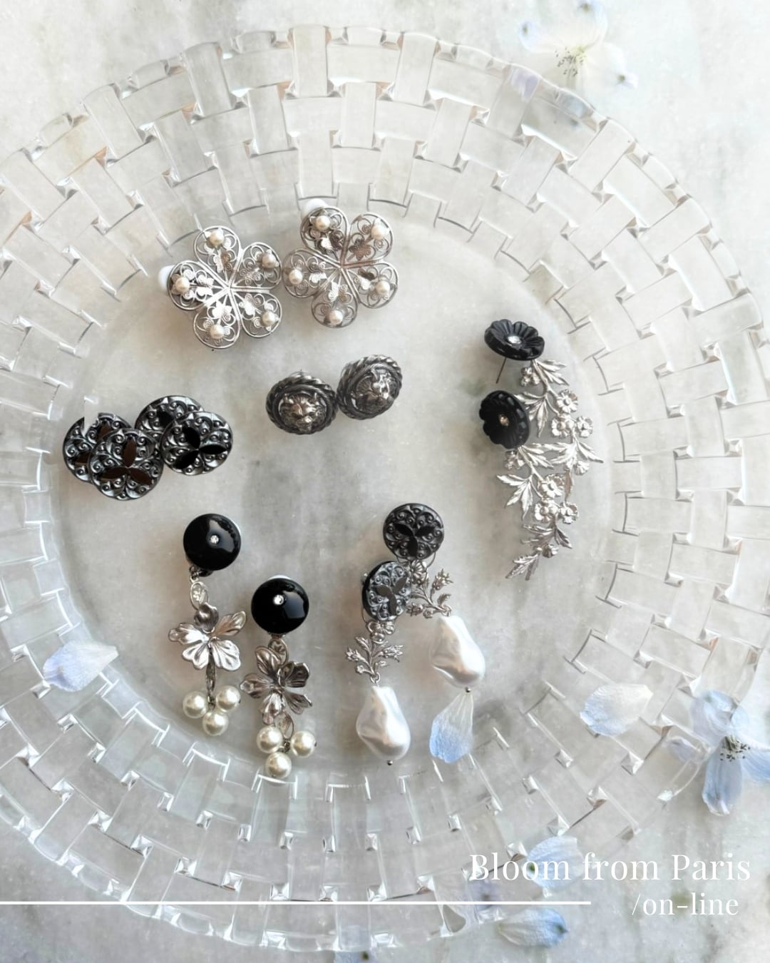 日本で鍍金加工を施したシルバー色のモチーフは家紋のような佇まいでシックな印象です。