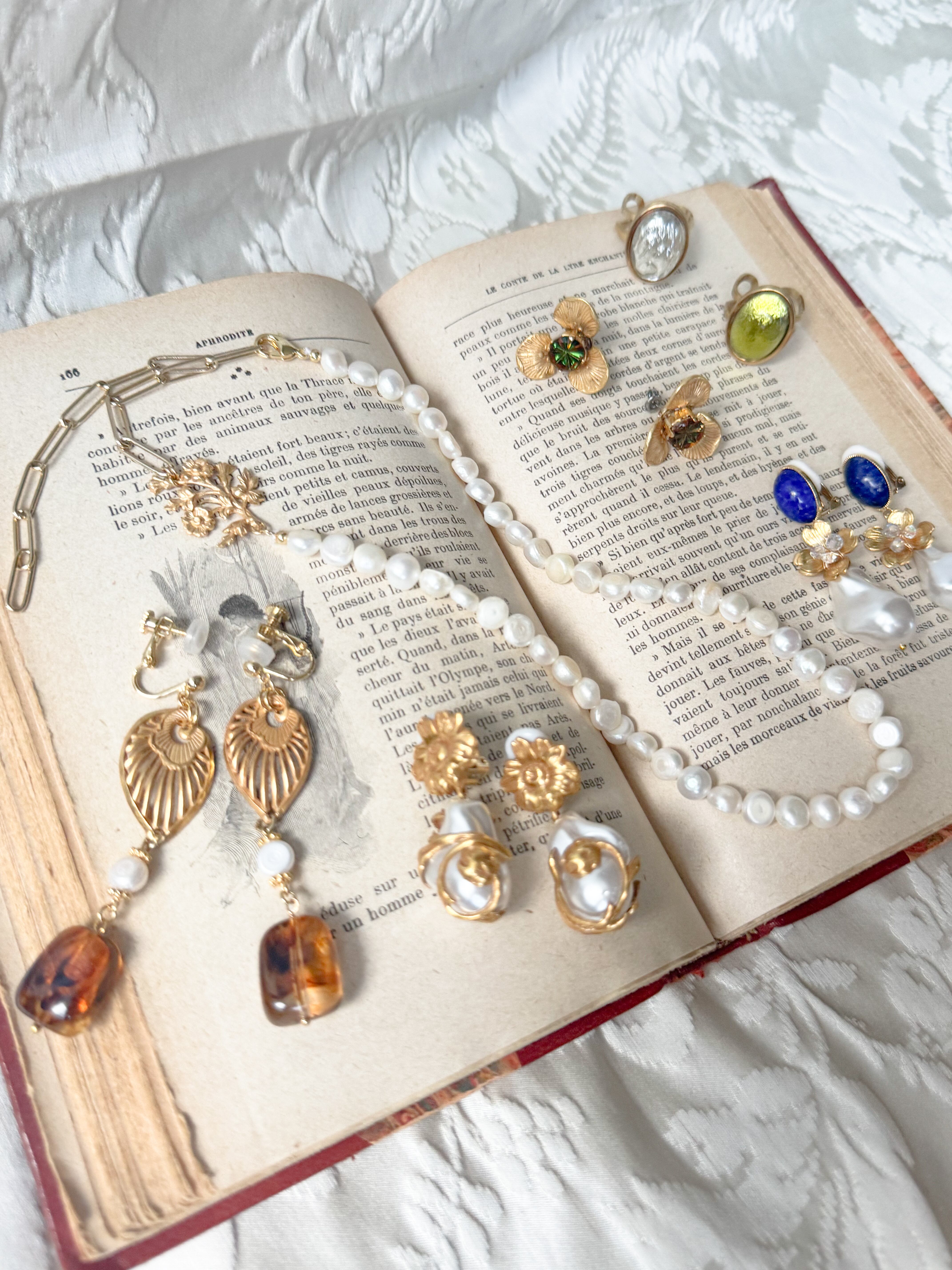 コーディネートに明るい輝きを添える天然のパールを使用した、
