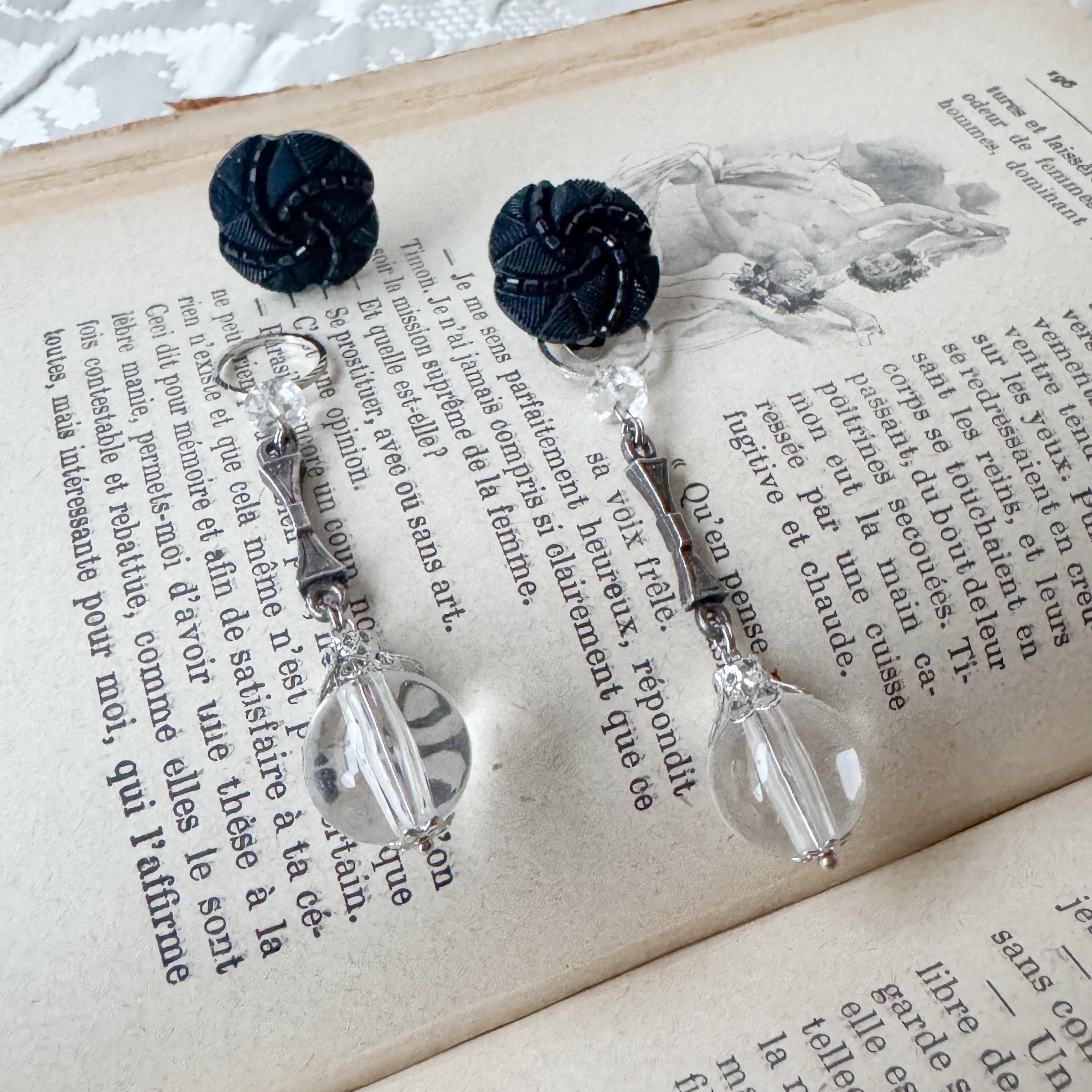 深い黒のヴィンテージボタンを加工したトップのパーツと、