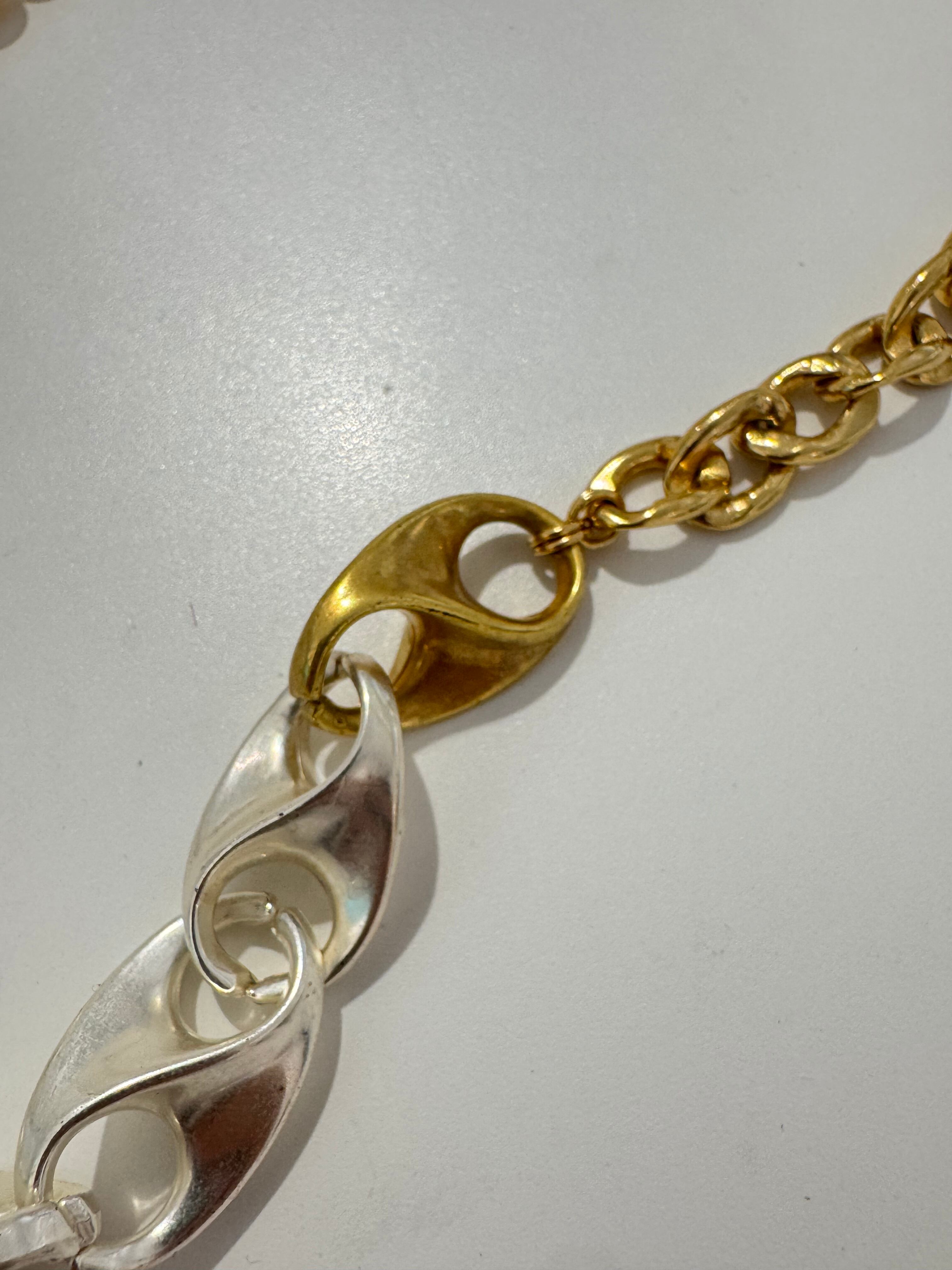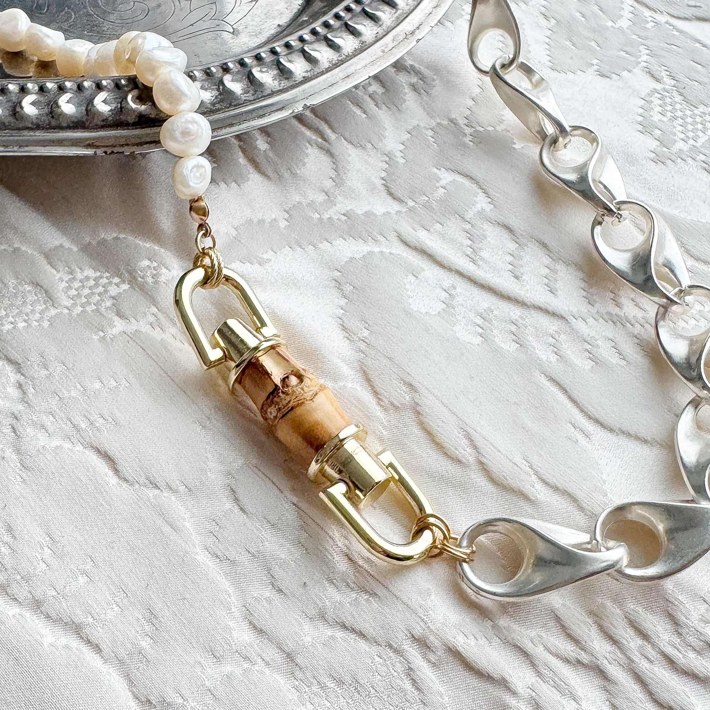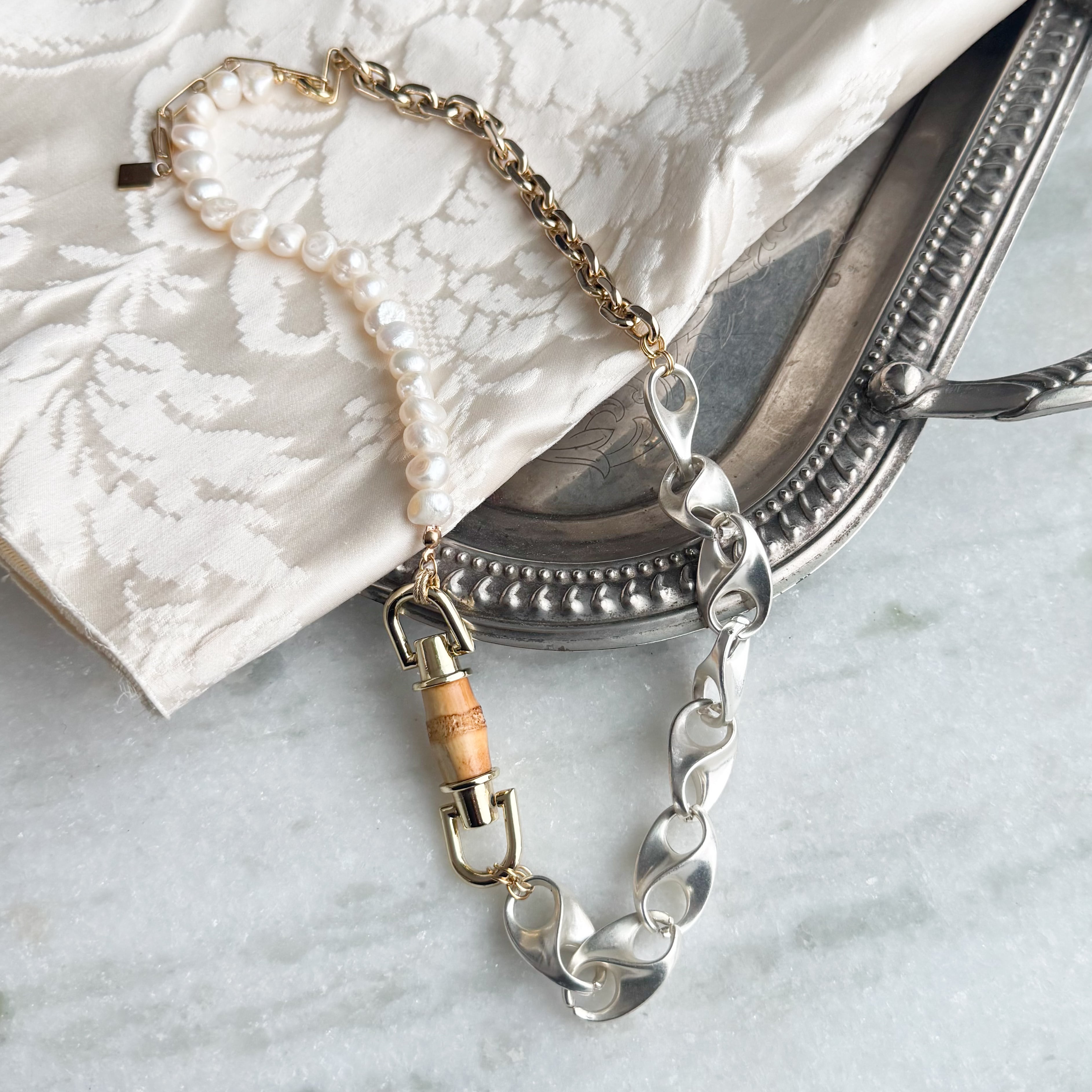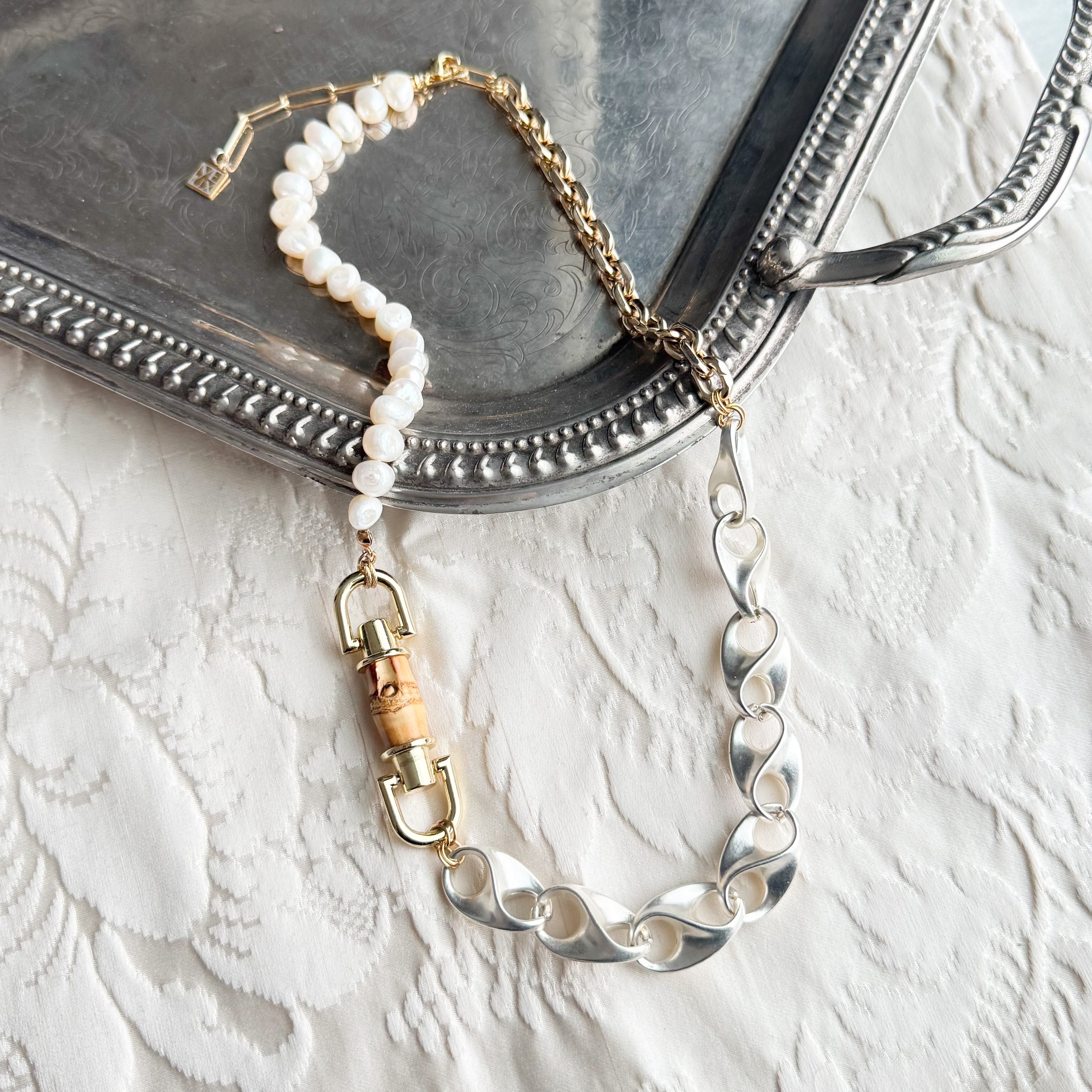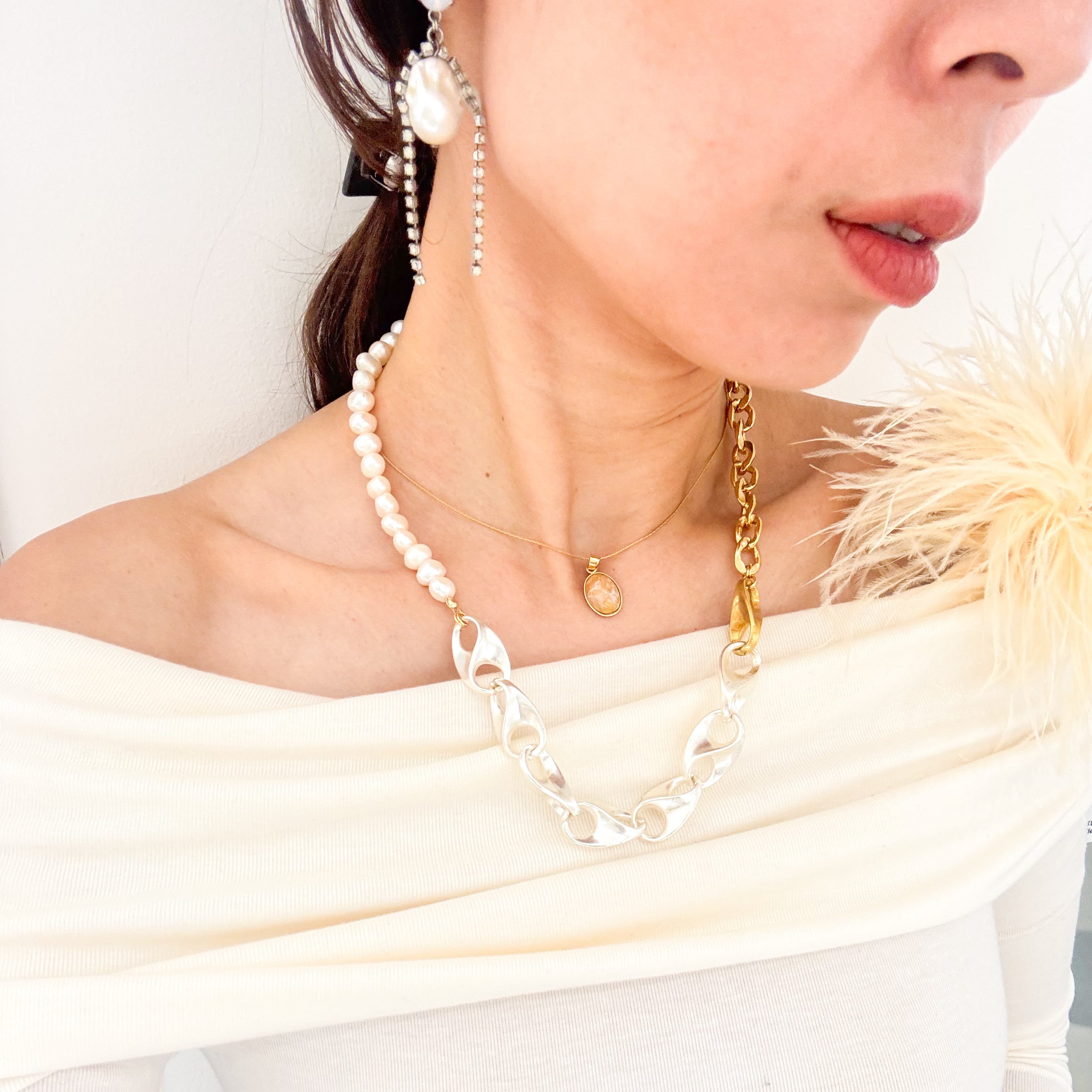 金属、パールの質感を加えたインパクトのあるネックレスです。